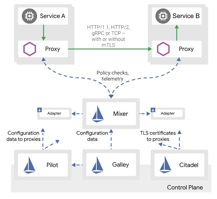 控制平面中,Galley 负责配置管理,Pilot 负责下发配置,Mixer 负责策略检查和遥测数据聚合,Citadel 负责通信中安全证书管理。