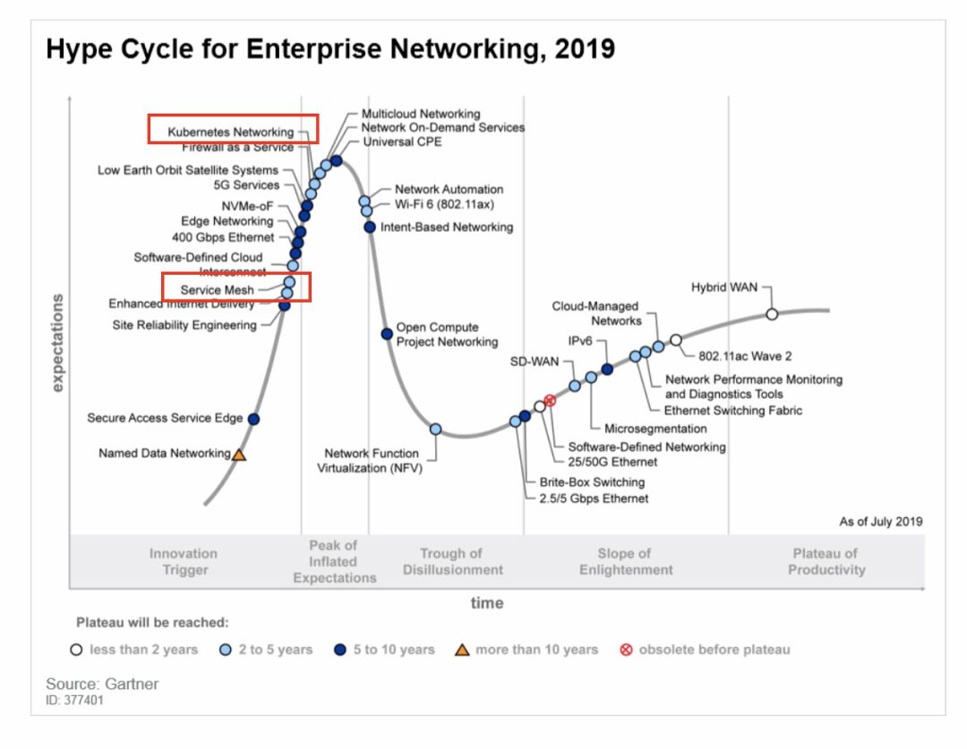 目前 Service Mesh 技术还处在技术成熟度曲线的初期,除了在 L4/L7 层提供灵活的服务通信功能,社区也在探索通过网络 Service Mesh[6] 实现灵活的 L2/L3 组网能力。