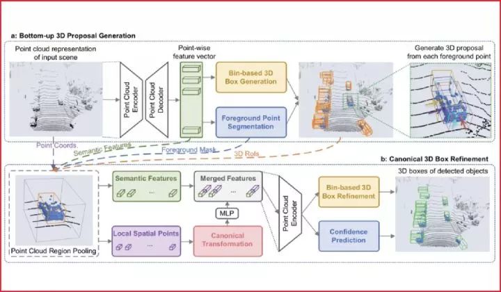 我们观察到自动驾驶场景中物体在3D空间中是自然分离的,从而我们可以直接从3D框的标注信息中得到点云的语义分割标注。因此本文提出了以自底向上的方式直接从原始点云数据中同步进行前景点分割和3D初始框生成的网络结构,即从每个前景点去生成一个对应的3D初始框(阶段一),从而避免了在3D空间中放置大量候选框。