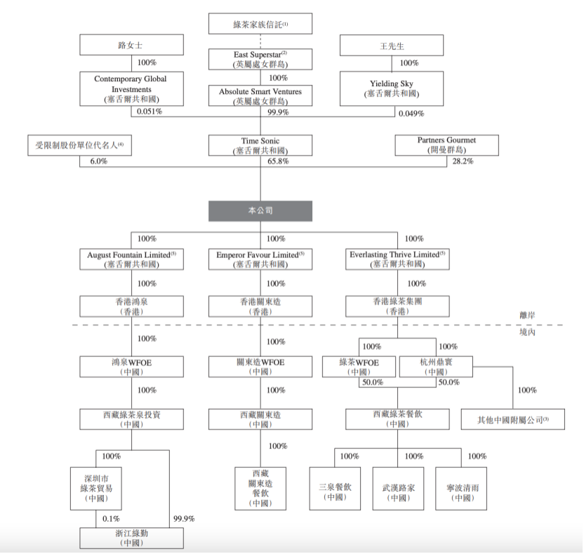 创始人路妍(路长梅)曾在2014年采访中,对媒体道出100亿规模的野心,以及接受融资的前提是,让员工做老板。绿茶成立14年来,唯一的外部投资者为合众集团(Partners Gourmet)。2017年,合众集团用了约7063.1万美元向王路夫妇控股的Time Sonic购买购买绿茶股份,当时占股30%,绿茶61家餐厅,估值2.35亿美元(约16亿元)。通过这笔交易我们可以看到,王勤松路长梅夫妇已身家10亿起。合众集团是一家来自瑞士的私募集团,至今已投资了近十余家中国本土基金,其中包括鼎晖、弘毅、今日资本、赛伯乐等。投中网曾统计,其2021年通过项目退出获得290亿美元收入(2020年:120亿美元)。合众集团曾在2015年底战略融资母婴产品零售商相关服务提供商爱婴室,而爱婴室于2018年在上海证券交易所上市(股票代码:603214)。但事实上,员工并没有成为绿茶的老板,反而家族企业基因愈发浓重。连锁餐饮集团大多是夫妻买卖,如海底捞、杨国福甚至捞王,绿茶也不例外。绿茶则是围绕王勤松、路长梅夫妇的家族生意。三名执行董事,分别是王勤松、路长梅弟媳于丽颖、以及王勤松侄子王佳伟。2020年,绿茶亏损5500万,其中拿到了政府补贴2311万元。执行董事于丽颖年薪370万,王佳伟170万。绿茶集团结构甚至,这对夫妇还设立了家族信托,分散风险、资产保值。王路夫妇将自己控股的Time Sonic 99%分别转移到王勤松的Yiedling Sky(占比49%)及路长梅的Contemporary Global Investments(占比51%)。绿茶成立家族信托或许是因为经历了从巅峰跌落为平常,绿茶家族开始未雨绸缪,提早进行财务规划。