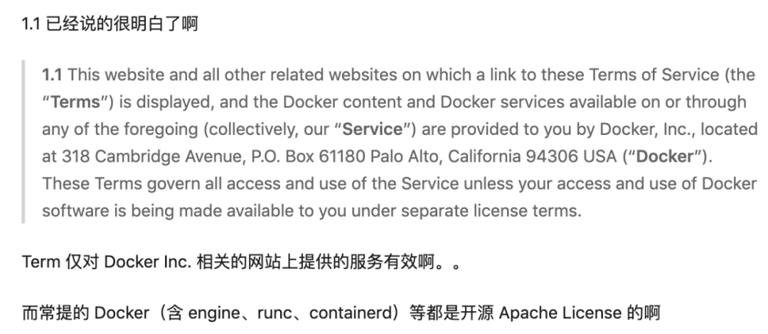 该话题在知乎上已有一些讨论,有网友指出此次 Docker 更新的服务协议只是针对 Docker Inc. 相关网站上提供的服务,而大家常提的 Docker(包含 engine、runc 和 containerd)依然是开源的 Apache Licence。