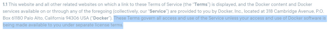 本服务协议管理所有服务的获取和使用,但在单独的许可条款下获取和使用 Docker 软件的情况除外。