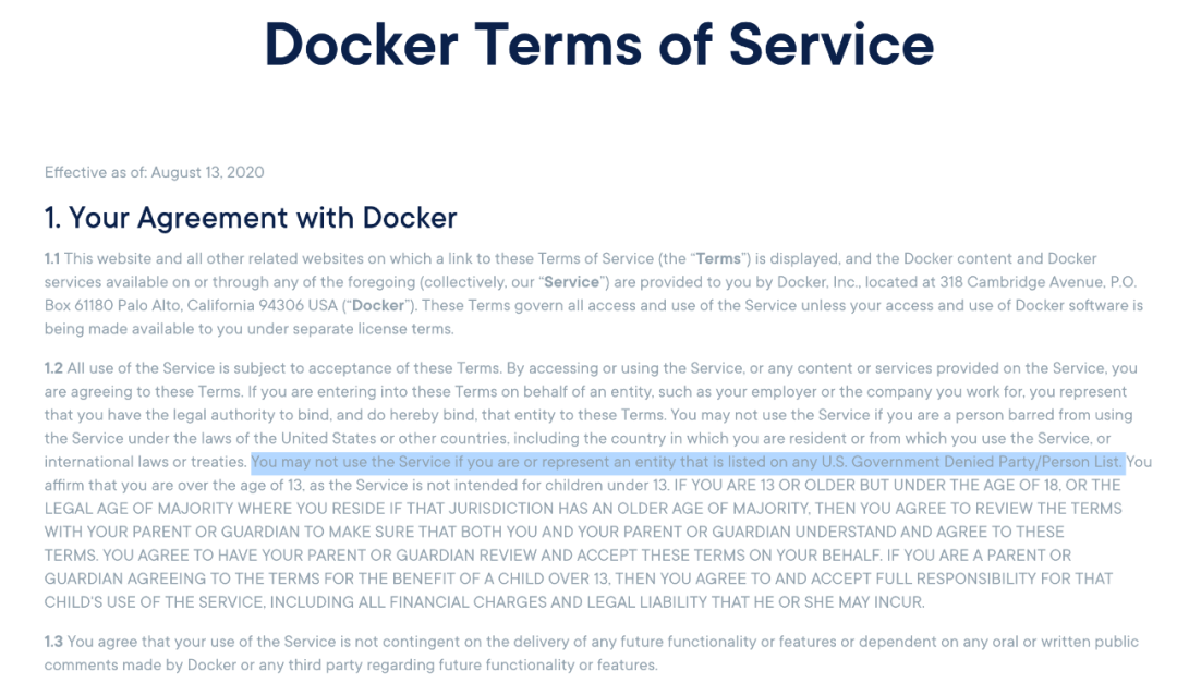 但是,日前 Docker 更新了最新《服务协议》,禁止禁运国家和被列入「美国实体清单」、「特别指定国民清单」、「被拒绝人清单」、「未核实清单」和「防扩散为清单」的组织和个人使用带有该服务协议链接的 Docker 网站和所有相关网站。
