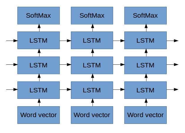 上图就是他所使用的网络。先忽略 SoftMax 这部分,稍后再做解释。现在,让我们检查一下他是如何把一系列单词向量放在底部的(请记住,每个单词向量都是关于这个单词的向量,由一串数字组成,就像我们在本文开头看到的那样)。Lars 输入了一系列单词向量,其中每一个单词向量都: