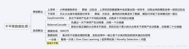 解决不平衡分类问题的策略可以分为两大类:一类是从训练集入手 , 通过改变训练集样本分布,降低不平衡程度;另一类是从学习算法入手 , 根据算法在解决不平衡问题时的缺陷 , 适当地修改算法使之适应不平衡分类问题。平衡训练集的方法主要有训练集重采样 (re-sampling)方法和训练集划分方法。学习算法层面的策略包括分类器集成 、代价敏感学习和特征选择方法等。