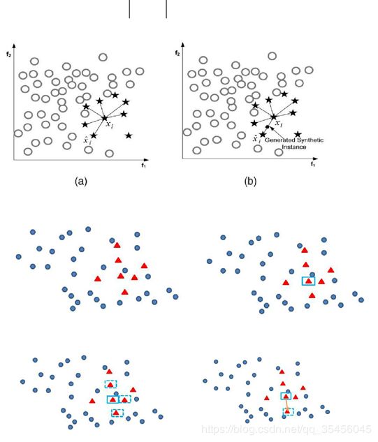 对于新产生的青色数据点与其他非青色样本点距离最近的点,构成一对 Tomek link,如图框。