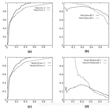 (a)和(c)为 ROC 曲线,(b)和(d)为 Precision-Recall 曲线。(a)和(b)展示的是分类其在原始测试集(正负样本分布平衡)的结果,(c)和(d)是将测试集中负样本的数量增加到原来的 10 倍后,分类器的结果。可以明显的看出,ROC 曲线基本保持原貌,而 Precision-Recall 曲线则变化较大。