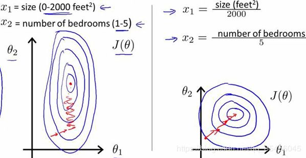 如下图所示,蓝色的圈圈图代表的是两个特征的等高线。其中左图两个特征 X1 和 X2 的区间相差非常大,X1 区间是[0,2000],X2 区间是[1,5],其所形成的等高线非常尖。当使用梯度下降法寻求最优解时,很有可能走“之字型”路线(垂直等高线走),从而导致需要迭代很多次才能收敛;而右图对两个原始特征进行了归一化,其对应的等高线显得很圆,在梯度下降进行求解时能较快的收敛。因此如果机器学习模型使用梯度下降法求最优解时,归一化往往非常有必要,否则很难收敛甚至不能收敛。