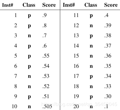 In signal detection theory, a receiver operating characteristic (ROC), or simply ROC curve, is a graphical plot which illustrates the performance of a binary classifier system as its discrimination threshold is varied。20 个测试样本,“Class”一栏表示每个测试样本真正的标签,p 表示正样本,n表示负样本),“Score”表示每个测试样本属于正样本的概率。
