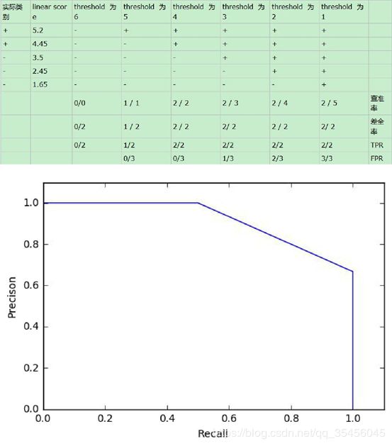其实,我们并不一定要得到每个测试样本是正样本的概率值,只要得到这个分类器对该测试样本的“评分值”即可(评分值并不一定在(0,1)区间)。评分越高,表示分类器越肯定地认为这个测试样本是正样本,而且同时使用各个评分值作为threshold。