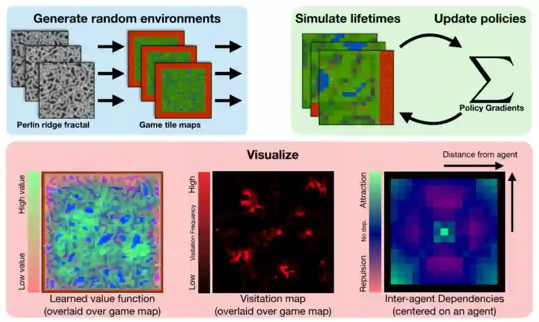 代理的策略是从多个种群中简单抽样——不同种群中的代理共享体系结构,但只有相同种群中的代理共享权重。初步实验表明,随着多智能体相互作用的增加,智能体的能力也随之增加。增加并发智能体的最大数量将放大探索行为;增加种群的数量将放大生态位形成——也就是说,种群在地图的不同部分扩散和觅食的趋势。