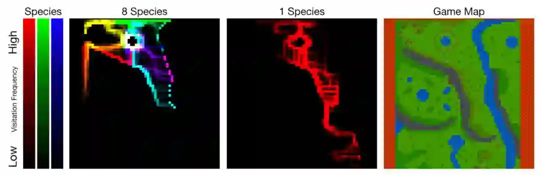 物种数量(种群数量)放大了生态位的形成。上图中访问地图覆盖了游戏地图;不同的颜色对应不同的物种。训练单一物种倾向于产生单一的深度探索路径。训练八个物种则会导致许多较浅的探索路径:种群扩散以避免物种之间的竞争。