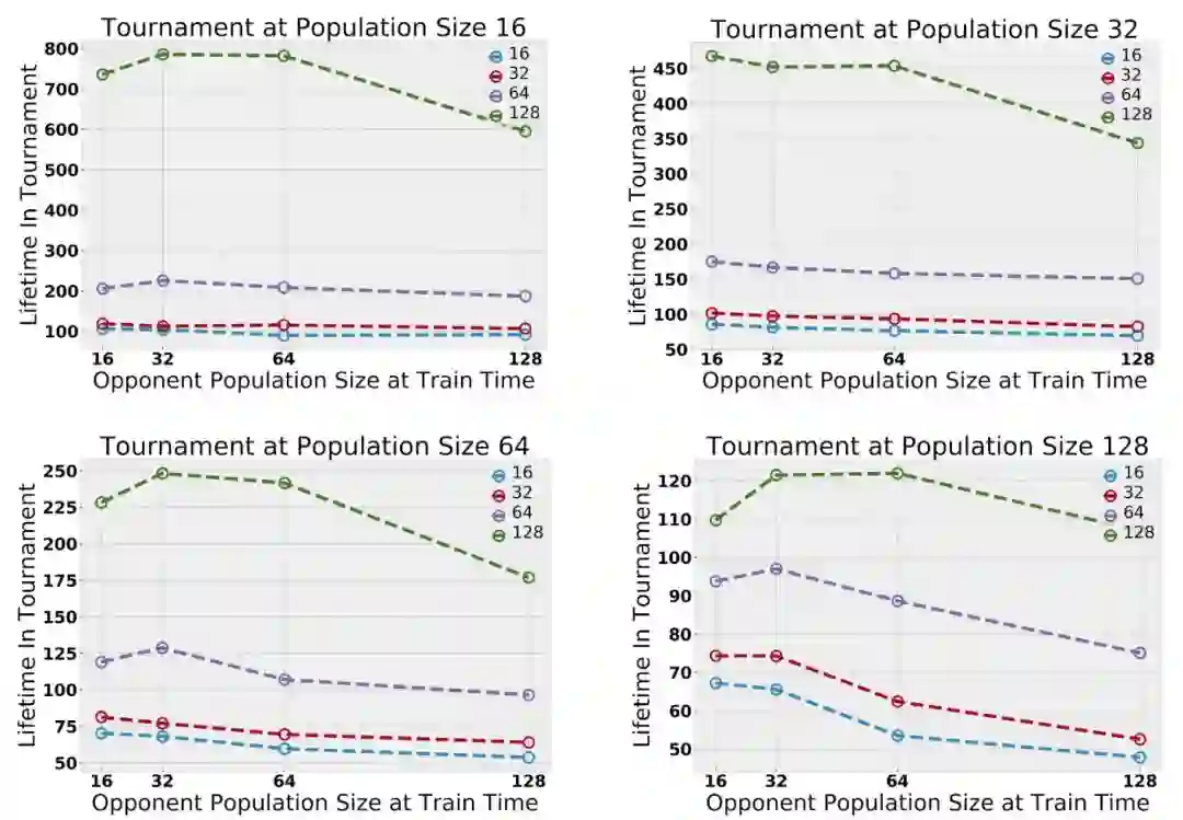 在评估跨多台服务器的玩家能力方面,并没有统一的标准。然而,有时,MMO服务器会进行合并。我们通过合并在不同服务器中训练的玩家基地来实现“锦标赛”风格的评估。这使得我们可以直接比较在不同实验环境中学到的策略。改变了测试时间范围,发现在较大环境下训练的代理一直优于在较小环境中训练的代理。