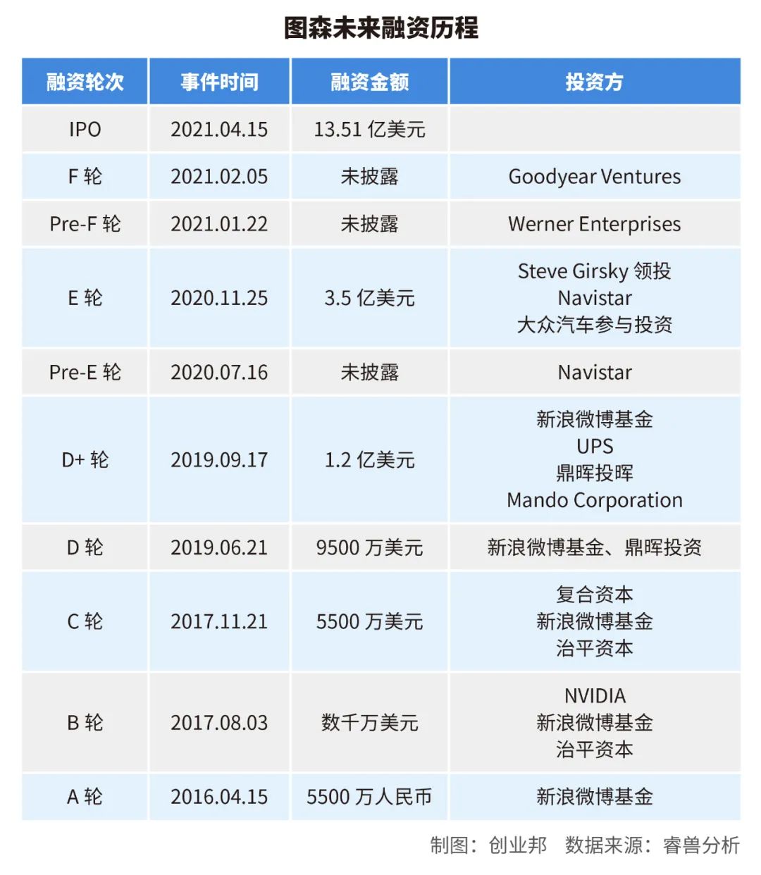 根据创业邦睿兽分析提供的融资轨迹显示,从A轮到最终实现IPO,图森未来一共获得了十轮融资,不完全统计情况下,IPO前的融资金额就超过了7亿美元。