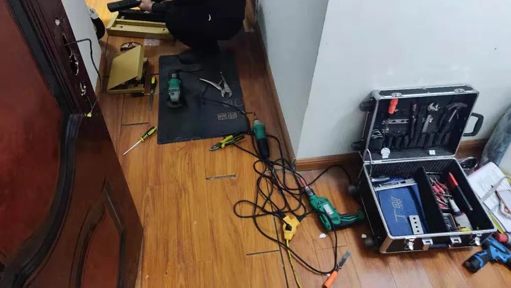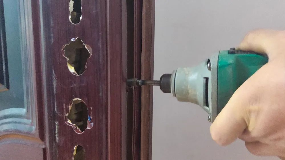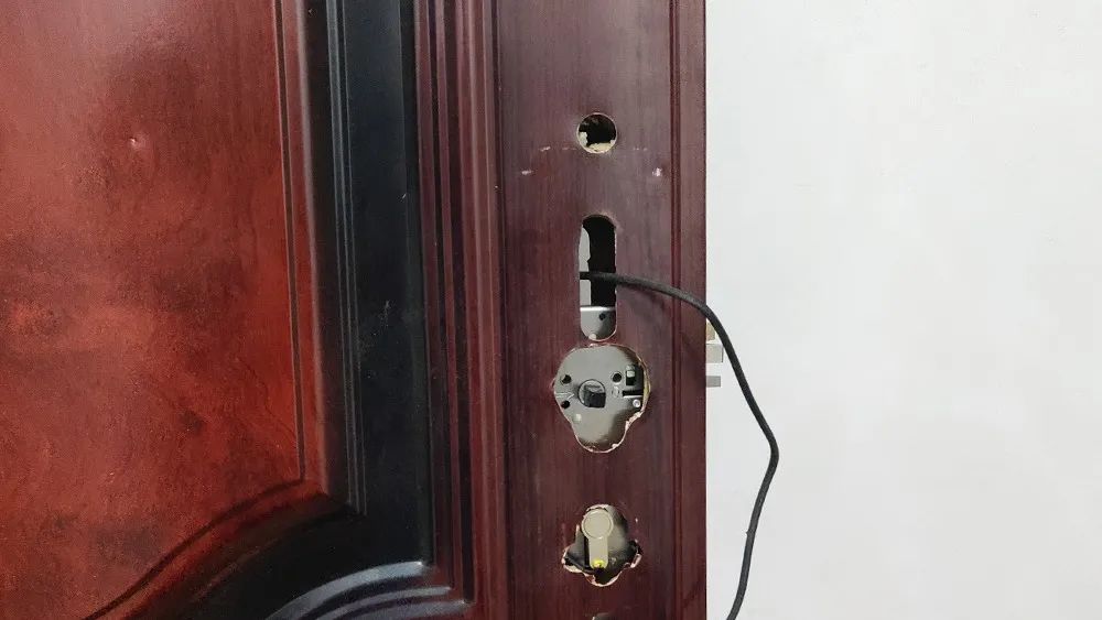 拆卸掉我原先房门上的锁具后,师傅测试了门锁面板的孔位,然后将原有孔位都做了进一步放大,采用专业工具一点点磨下去,并且将边缘处都做了修缮,没有毛刺感。