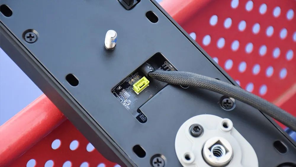 面板背部采用了非常厚实的金属板材作为支撑和包裹,并有密集的螺丝固定。在靠上方的开孔处从门锁主板延伸出来一条编织线材,用来与内侧门锁面板相连,旁边的一个座子是用来与锁体的线材连接的。