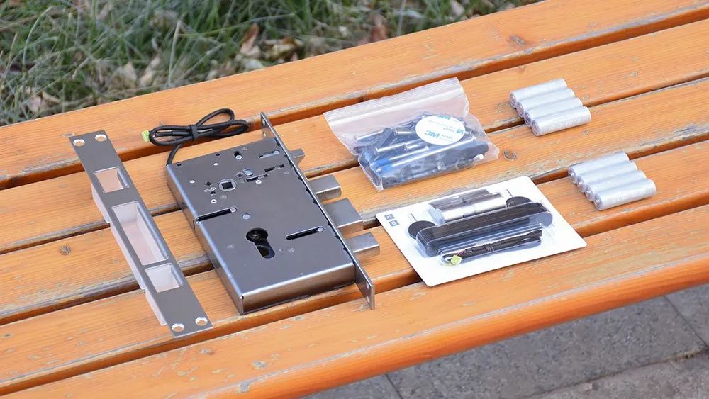 以上是一张附件全家福,包含门扣板、锁体、螺丝钉、锁芯套装以及五号电池。