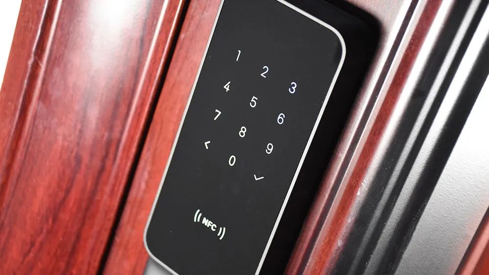 外侧门锁面板上方是一整块触摸交互和显示区域,最上方是一条状态指示灯;中间是大面积的触摸区域,分布有数字按键以及删除/确认键;靠下的位置是三颗状态指示灯,下方留空的区域是 NFC 感应模块。