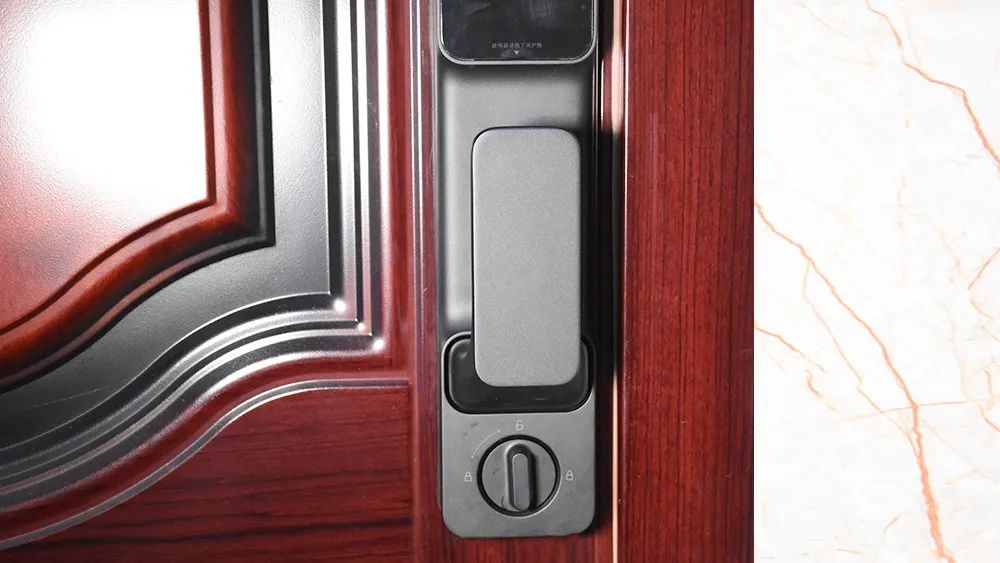使用已经录入指纹的手指顺势搭在推拉扳手上,成功匹配指纹信息后屏幕上方的条形指示灯会显示白色亮起并辅以声音提示,同时向外拉动推拉扳手即可打开房门,整个操作过程一气呵成。