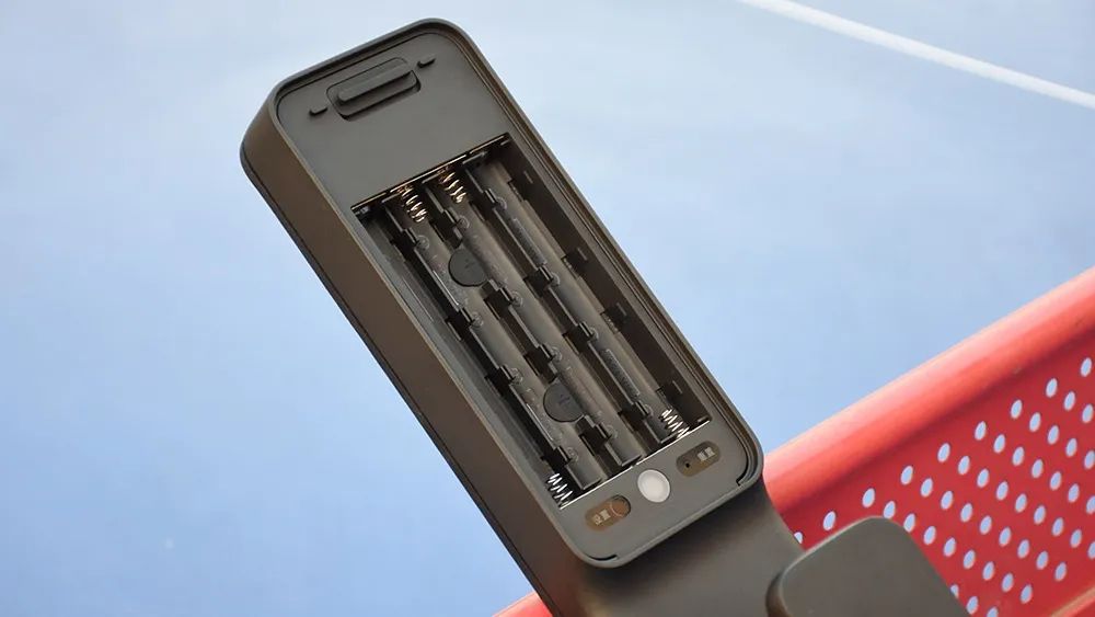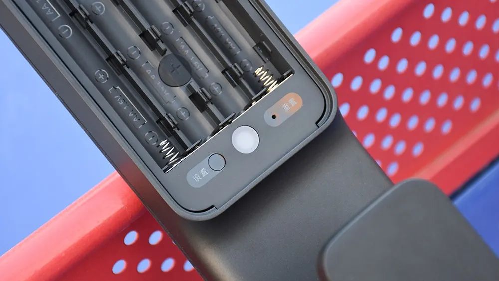 内侧面板基本与外侧保持一致的设计,最上方是电池仓位,外侧盖板可以通过顶部的固定卡扣打开,电视仓内可以容纳 8 节五号电池。在电池仓下方有设置按键和重置软键,便于主人在室内对门锁进行设置和重置操作。