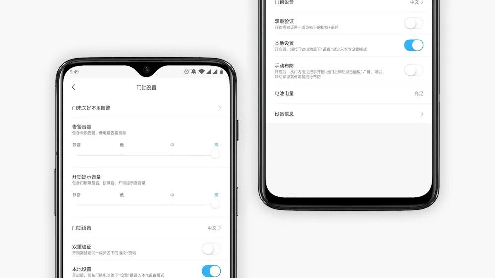 在门锁设置中包含对门锁提示音量、语音设定、双重验证、本地设置、手动布防、电池电量查看等功能。双重验证即为开锁时需要验证同一位用户的指纹和密码信息,必须两个信息同时验证通过后才可以开锁,进一步增强安全性;手动布防开启后可在出门后点击外侧面板上的对勾按键进行布防,也可以联动家里的其他设备进行安全布防。