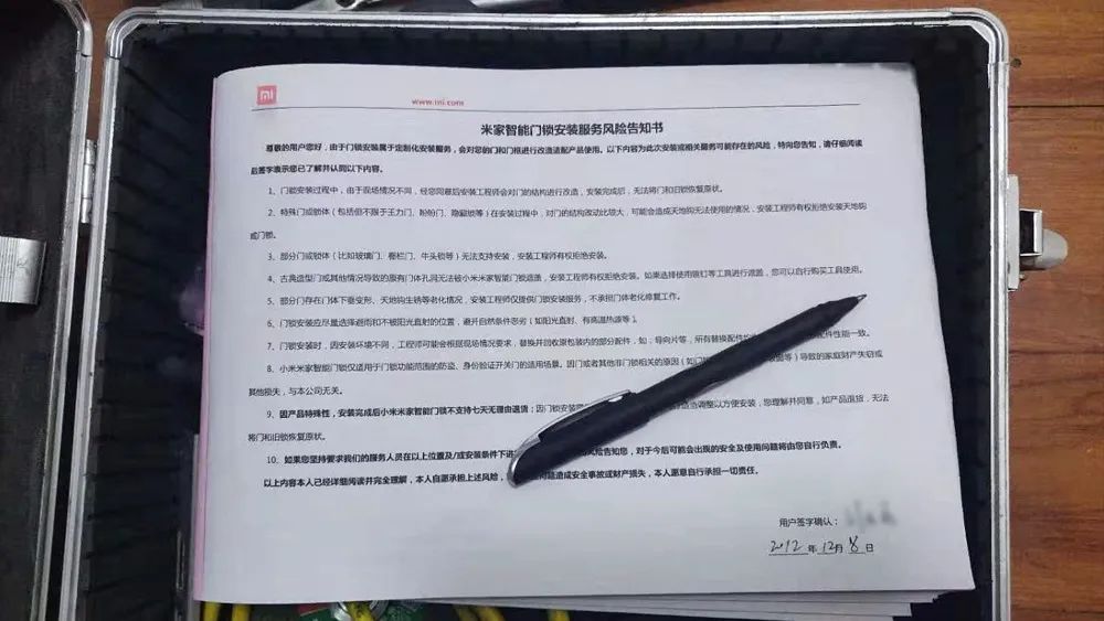 在安装之前师傅让我按照规则签署了“米家智能门锁安装服务风险告知书”,并告诉我在安装过程中可能会因为原先房门上的开孔不合适而必须再次开孔等问题。