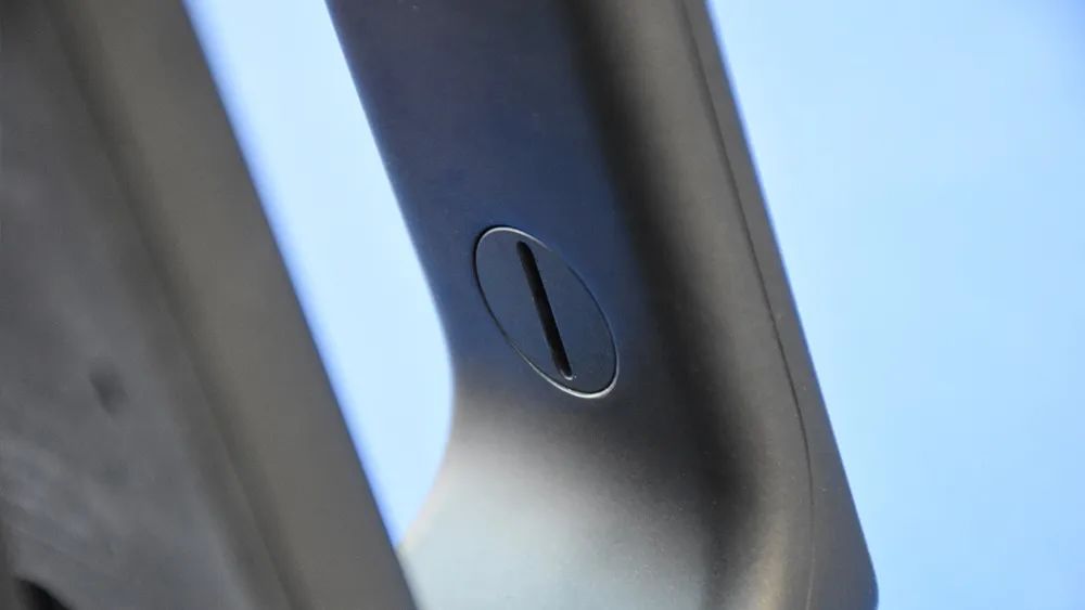 推拉板手内侧靠下的位置是一个旋钮,其功能是在旋转至水平方向以后可取下推拉板手外侧的保护盖,然后用卡针将面板下方的保护罩取下,再通过实体钥匙打开门锁,某种意义上讲也算是提升了实体钥匙孔的隐蔽性。