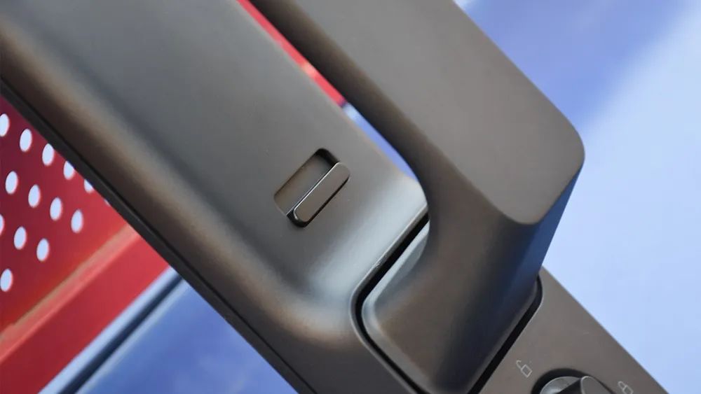 在推拉板手顶端的位置设计有凹陷式的指纹识别区域,指纹模块的大小比 iPhone 当年的指纹识别区域要大上一圈,并且与门锁整体的雾面质感不同,选择了高光亮面的工艺质感,也比较容易辨认。