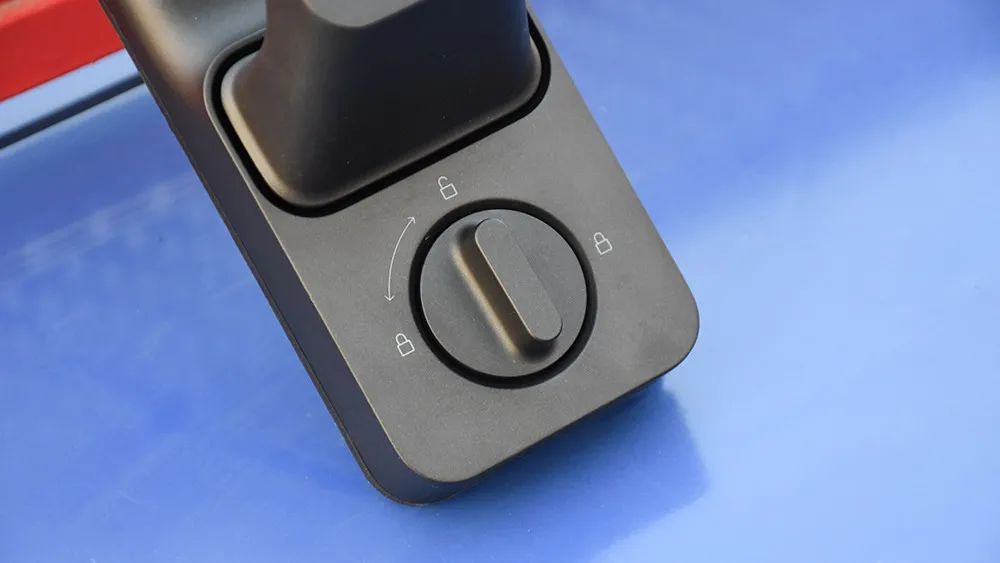 在内侧面板最下方的位置是反锁旋钮,并且支持按压式操作,可以避免小孩误将自己反锁在室内。反锁旋钮的阻尼还是比较大的,按压时需要稍微用一些力气,旋转到位后会有明显的顿挫感反馈,但并不会有比较大的“异响”。