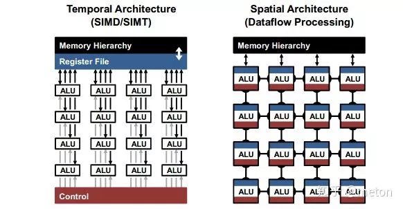 SIMD和SIMT本质上是一种时间上的并行展开,属于Temporal架构,怎么理解呢?就好比一个循环并行,我每个并行计算单元做的是某次迭代的事,相当于把通用CPU在一段时间内的循环操作在我们的加速器的并行单元上一次性展开了。