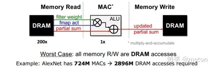 上图展示了DNN加速器在体系结构设计所关注的几个点:数据的读写也就是访存,以及计算。尤其是访存问题,因为通常PE数目很容易堆上去,并行度上去后,数据读写往往会成为瓶颈,也就是常说的撞到“内存墙”,内存访问在我们的机器上是有层级的,寄存器,cache很快,但是到了内存取数就很慢,数据在cache miss后代价会很大,因此如果没有很好的访存优化,那么对于大数据的深度学习,加速比是很难做上去的。