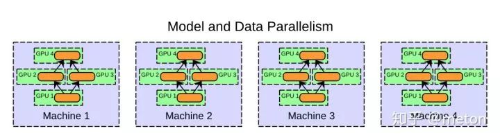 当然实际上还会有数据并行和模型并行的结合,可以从这个角度理解: 模型各个部分分散在单机的多个GPU中(模型并行),同时模型在多个机器都有副本,数据各个部分分别喂给各个机器并行训练(数据并行)。