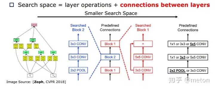 可以通过增加一些搜索约束来减少探索空间,例如 权衡架构的宽度;放低所要达到的性能目标;结合domain knowledge,通过现有的人工设计经验来缩小探索范围。下面是一种搜索的例子,将设计空间设定为 layer operations和 layer connections的不同组合,然后NAS系统在人工设计的几种选择组合选项中进行搜索: