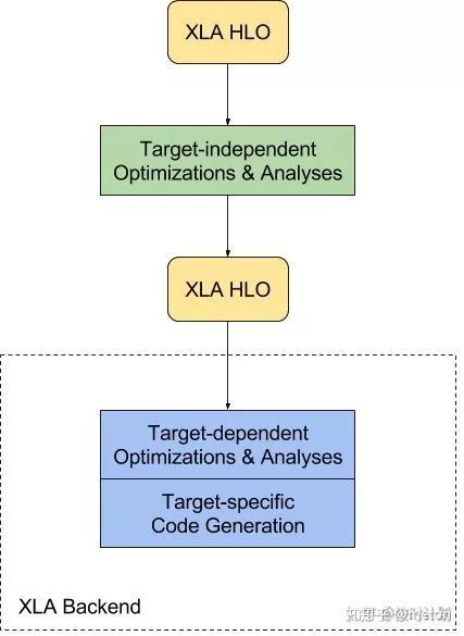 到后端去做进一步的HLO级优化,HLO级优化会针对硬件目标特定信息和需求,如XLA GPU后端的算子融合、确定如何将计算划分为流。此阶段,后端还可以将某些算子或其组合与优化的库调用进行模式匹配。