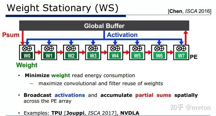 提高PE的利用率. 意思是尽量使得PE忙碌,一个方法是增加片上缓存大小,提高访存总线宽度等等入手,这些都旨在减少访存的瓶颈,PEs可以更快拿到数,减少等待时间;另一种方式是让数据尽可能在数据通路中多停留,这样在访存能力不变的情况下,就可以用流水线的形式让PE尽可能有事做,后面讲解的TPU所用的脉动阵列,和流行的 DtaFlow数据流架构都是类似方式,当然在GPU的设计上也可以融入上述通用思想.