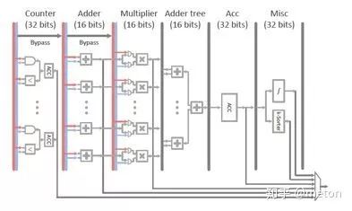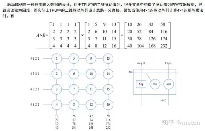 TPU使用了脉动阵列,这是一个很有趣的点,脉动阵列在很早之前就已经出现,后来被认为实用性不大,但是在深度学习时代,计算密集的大矩阵运算让脉动矩阵焕发活力,可以算是加速器设计的重新考古发现。关于脉动阵列的计算方式可以参考https://github.com/meton-robean/PaperNotes/issues/3