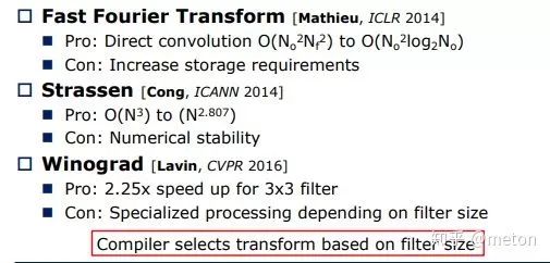 使用其它的卷积近似替代算法,可以减少复杂度。不过有些算法有使用条件,像Winograd只是对小卷积核操作有比较大的优化效果。傅里叶变换似乎不太常用,因为要达到理论上的加速,要求卷积核要很大才可以,而实际上深度学习用的都是小卷积核。
