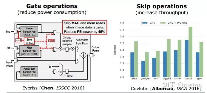 为什么稀疏是一个对硬件设计友好的特性呢?首先,减少不必要的乘法操作。0乘上任何数都是0,那么如果有0出现的话可以不使能乘法单元去计算,直接输出结果0,这样可以节省运算产生的功耗;乘法的操作数有0的话,不必费力去内存取0,直接有个存0寄存器输出0给乘法单元即可,这样就减少了数据搬移的开销。体系结构设计上可以利用剪枝的思想,把很小的只裁剪成0,这样就增大数据稀疏性,这里说的剪枝是硬件实现的剪枝。