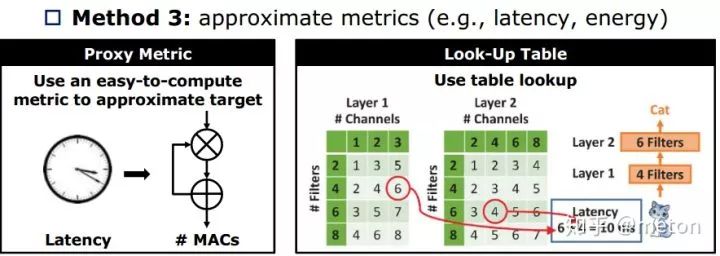 估算搜索出来的网络架构的参数,由此推算该网络的乘加操作次数,如果超出了设定的约束范围,那么可以间接预估出该网络架构过于复杂,不符合要求,那么直接丢弃这个设计,连训都不用训。另外可以建立查找表记录各个搜索出来的网络架构的时间,根据表中信息,可以推算出新网络架构的时间。
