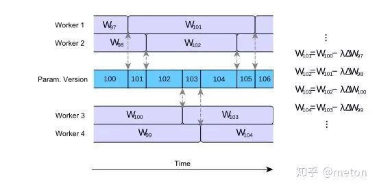 参数平均和基于梯度的方式本质上都是同步更新方式,有同步就有异步方式(基于梯度的方法本身可以做成异步更新的方式)。异步是说参数服务器不再等待最后一个worker才开始操作,而是有worker的参数到了,我这边就开算,不进行等待。那么两种更新方式的区别是啥?