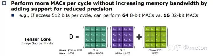 进一步,有些CPU/GPU支持INT8 INT16低精度运算,在取相同的数据量情况下,还可以进行更多的乘法运算(4个INT8 相当于原先一个 FP32所占的空间)。