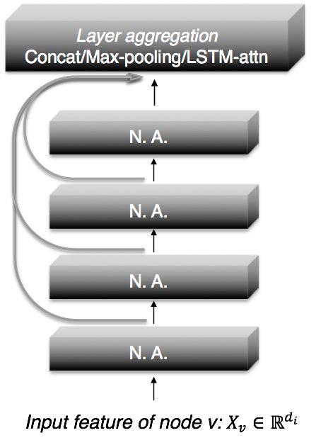 在algorithm 1中用到了Concat操作,即将历史Embedding与当前Embedding进行拼接,Concat操作可以看作是利用历史Embedding的一种方式。更多的利用方式在Jump Knowledge Networks中: