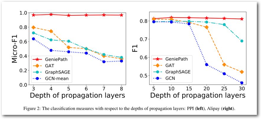 由图7可看到,GeniePath在应用Attention机制之后又过了一个LSTM,从实验的角度看,这种做法使得GCN的层数增加并保持模型的效果不衰减,但是同时也增加了大量的参数。