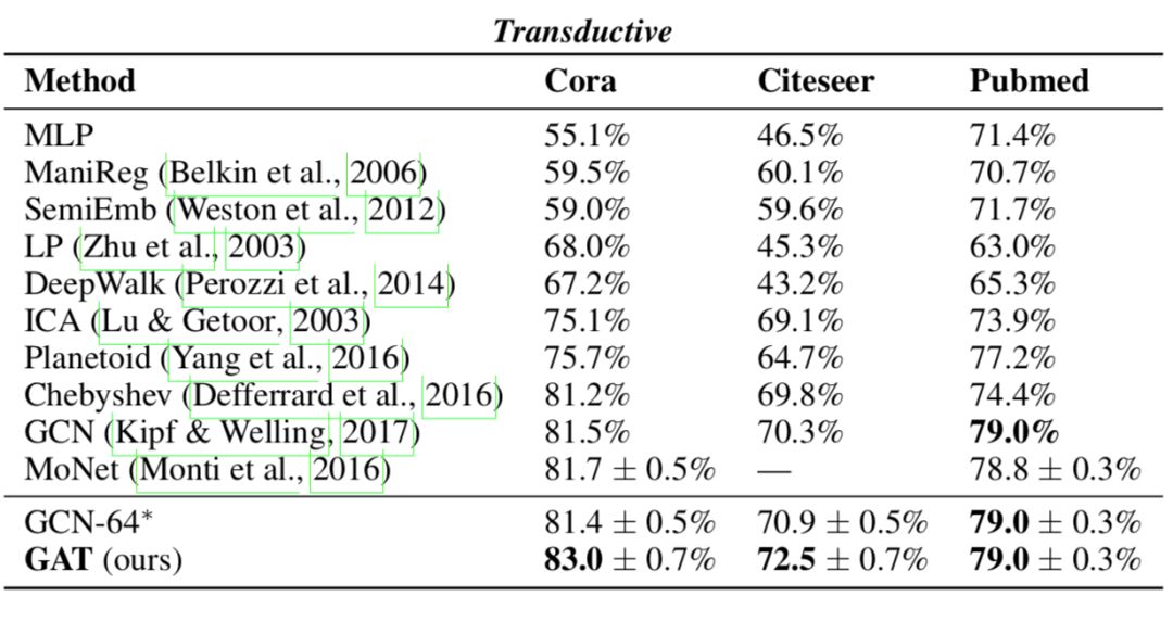 Figure 5 GAT在TransductiveLearning实验中的效果