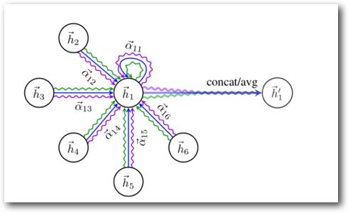 Semi-GCN邻居权重是固定的,且只与节点的度相关,GraphSAGE邻居权重固定是1。GAT利用Attention机制(公式3)学习邻居权重,利用multi-head机制增加稳定性。