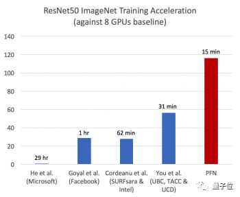 另外一个例子来自去年11月。伯克利等大学的学者,只用32分钟就完成了Resnet50模型的训练,超过Facebook团队此前60分钟的记录。不过一周后,Preferred Networks把这个时间缩短到15分钟。