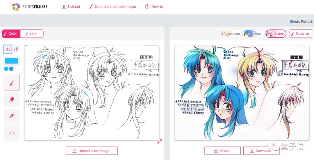 在漫画线稿上色AI这个领域,PaintsChainer的大名如雷贯耳,技术几乎可以算是标杆。你只需上传一张黑白线稿,点一个按钮,背后的AI自动为你生成一张彩色漫画。