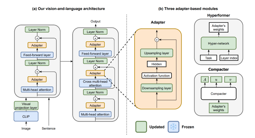 将三种流行的基于适配器的方法(Adapter, Hyperformer, Compacter)与标准的完全微调和最近提出的提示微调方法进行比较,应用到多模态任务。