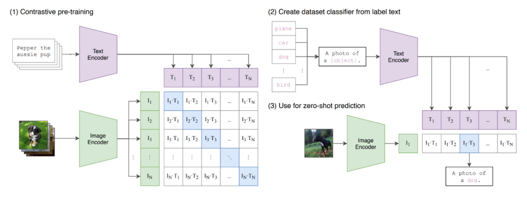 2. 使用对比学习的方法,做图文匹配的任务,计算相似度。给定 batch=N 的 image-text pairs,CLIP 预测 NxN 的概率(利用线性变换得到 multi-modal embedding space 的向量,点乘计算得到相似度),对角线即为正样本,其它都是负样本。