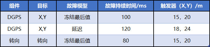 本次研究所做 FI 仿真试验为在交通流畅的城市环境下,以 45km/h 的恒定速度行驶并开启车道保持功能的车辆,当车辆在弯道上行驶时将触发故障,再现与差分 GPS(DGPS)和转向系统相关的功能失效模式。实验中所设置故障列表如表 1 所示。